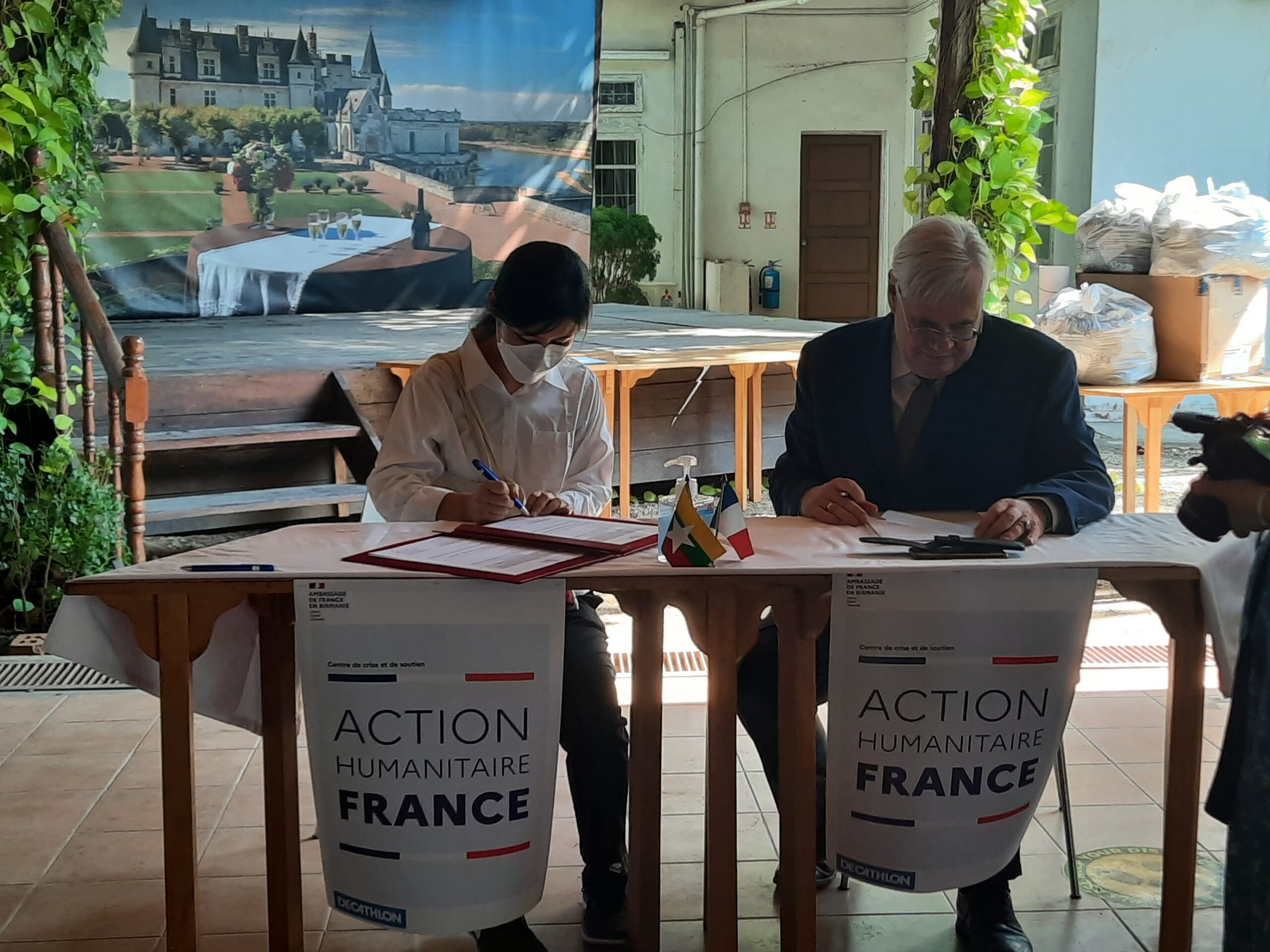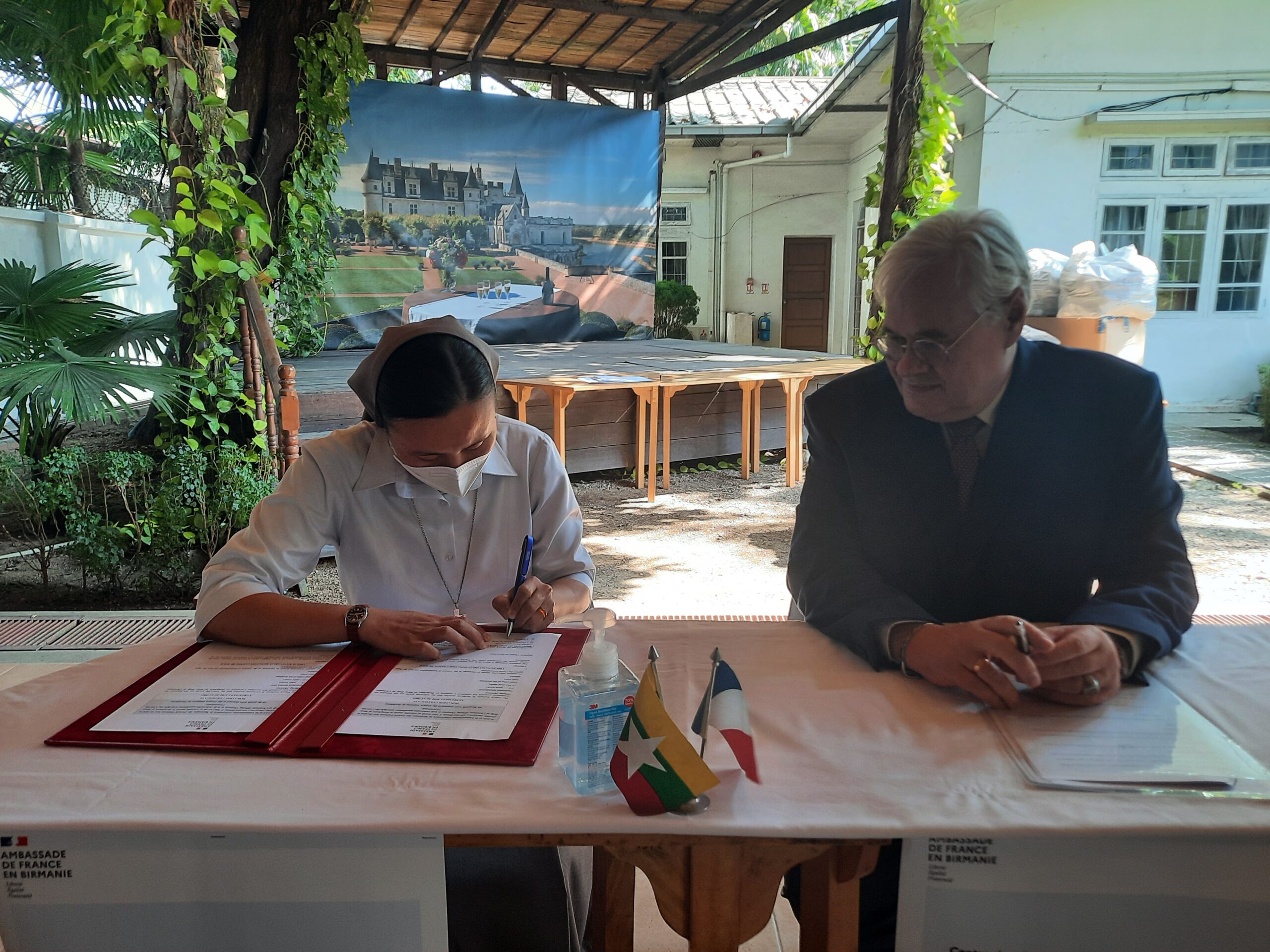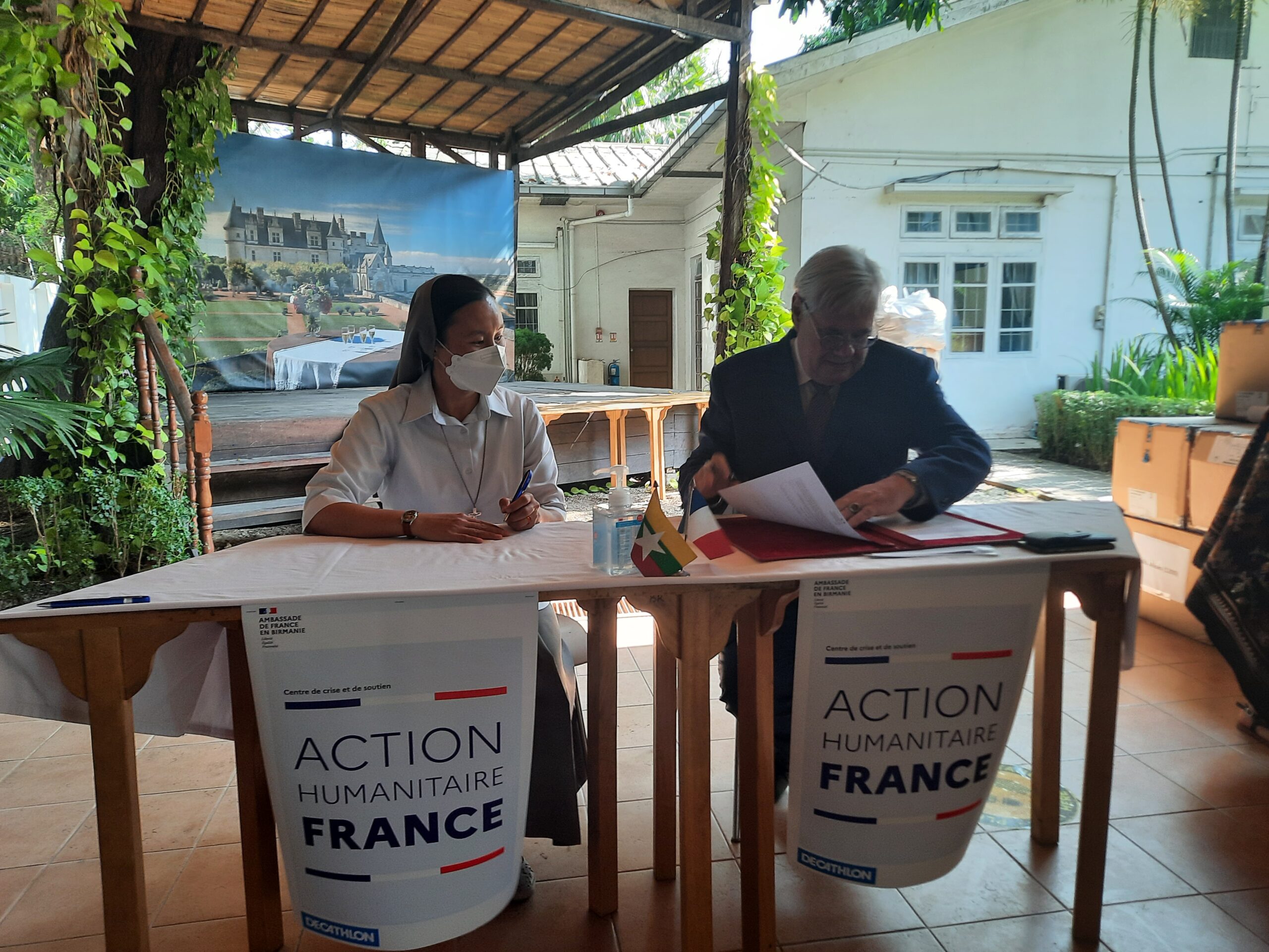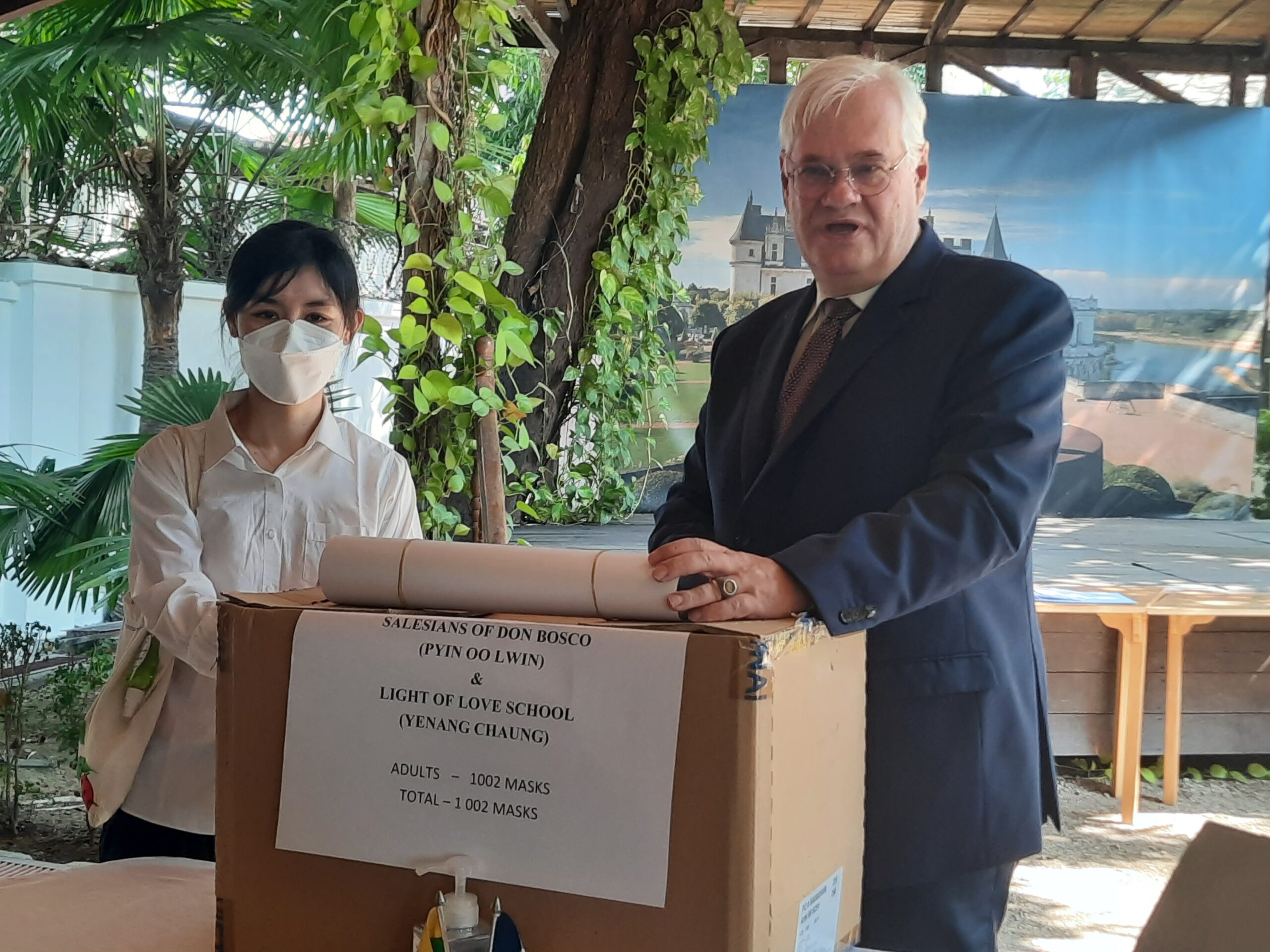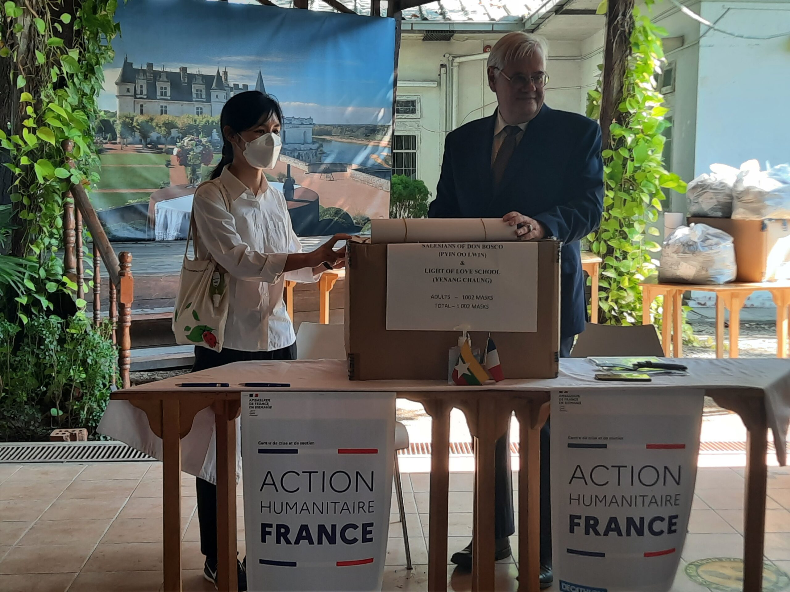 In Anwesenheit von Herrn LECHERVY, dem französischen Botschafter in YANGON, hat ZOE TRUTWEIN bei einer Zeremonie im Institut Français in Yangon 1.000 Masken (COVID) zugunsten der Kinder der Schule von YENANGYAUNG und des Waisenhauses von PYIN OO LWIN entgegengenommen.