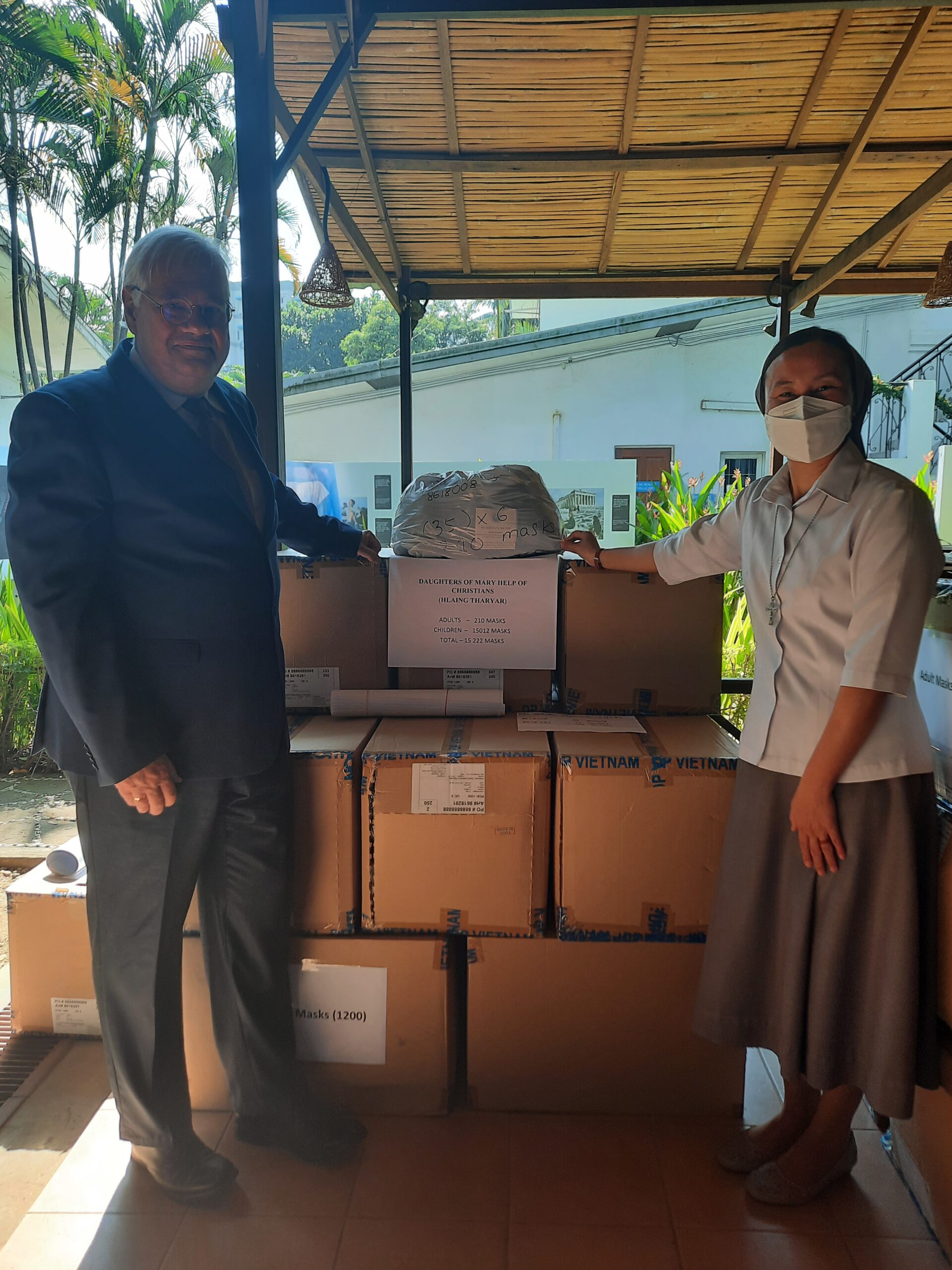 Wir hatten auch um 15.000 Masken für den Slum HLAING THAR YAR in einem Vorort von YANGON gebeten, dem die Salesianerinnen der Werke von DON BOSCO wertvolle Unterstützung leisten.